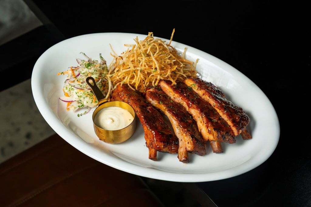 Lychee wood smoked pork ribs, frites and coleslaw