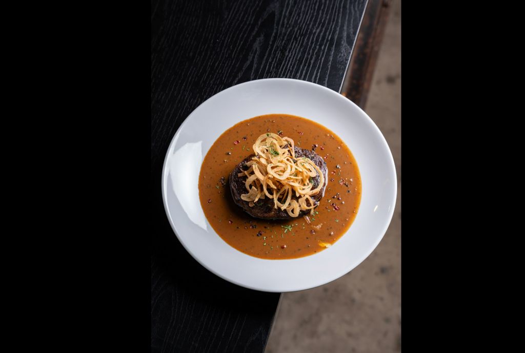 Gras fed Black angus rib eye served with a cognac black pepper sauce & crispy onions