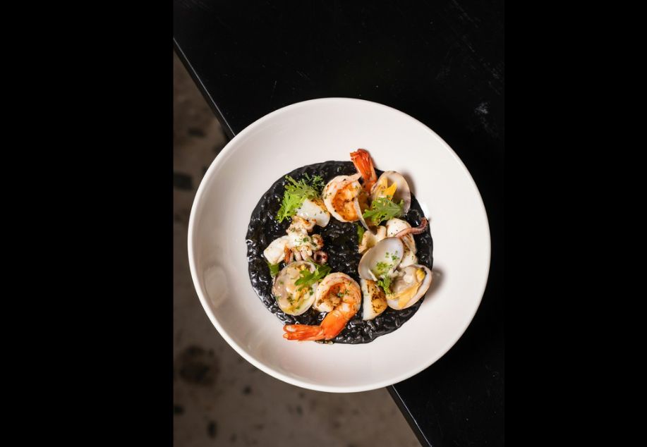 Squid ink risotto with bbq shrimp, squid, clams & scallop