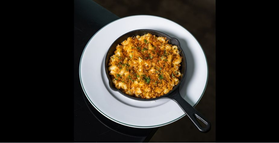 Cheesy & gooey mac & cheese. Topped with ritz cracker crumble