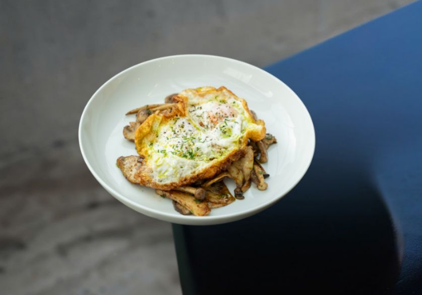 Mixed mushrooms roasted with garlic served with a crispy egg